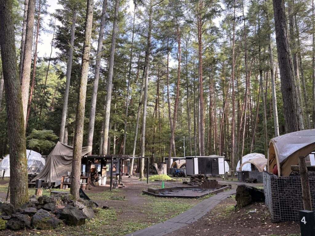 河口湖ICから車で約10分ほどの場所にある、森の中のグランピング施設です。