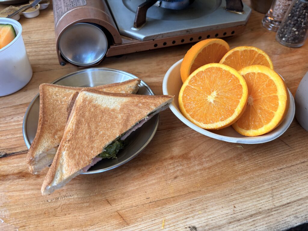 湯気の立つコーヒーと一緒にいただく朝食は、まさにグランピングならではの贅沢なひとときでした。