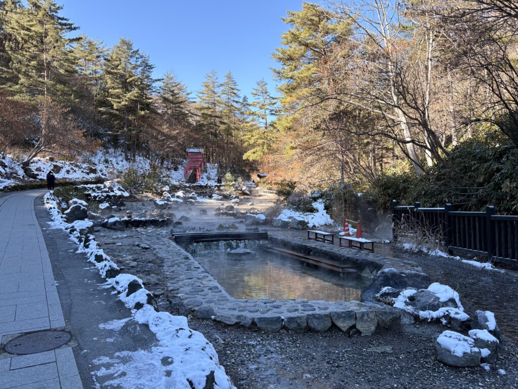 湯気が立ち上る川沿いには、至る所に足湯スポットがあります。大自然の中で温かいお湯に足を浸すのは、最高のリフレッシュになりますよ。