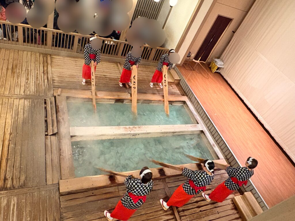 「チョイナチョイナ〜♪」という独特の掛け声とともに、大きな板でお湯を力強く仰ぐ「湯もみショー」を観覧しました。